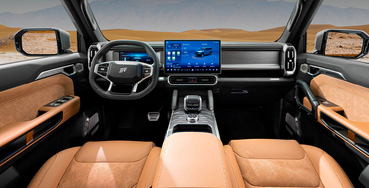 Салон T2 – это продуманное пространство для комфортных путешествий всей семьей. Удобный и функциональный интерьер предлагает качественные прочные материалы отделки с применением кожи и алькантары. В центре – два дисплея и консоль с шайбой выбора режимов движения. В автомобиле предусмотрено порядка пятидесяти мест для хранения вещей. Многофункциональный руль, эргономичные сиденья и атмосферная светодиодная подсветка в салоне дополнительно повышают удобство водителя и пассажиров даже в самых длительных поездках. Применение экологически безопасных материалов в сочетании с двухзонным климат-контролем, эффективным фильтром CN95 и системой ионизации воздуха гарантирует отсутствие неприятных запахов в салоне.