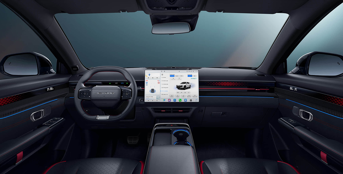 Стилистика минимализма сохранена и в интерьере. В основе его организации лежит продуманная эргономика и высокое качество материалов. В отделке салона используется 118 типов материалов, в том числе с антибактериальными свойствами для руля, сидений и других зон. Дополнительную заботу о здоровье водителя и пассажиров обеспечивает современная система очистки воздуха, которая включает салонный фильтр N952, систему мониторинга частиц PM2,53 и угарного газа, а также систему ионизации воздуха.